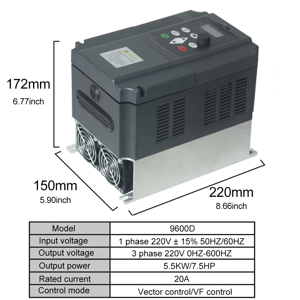 Tipo | 0,75 kW 220 VFD | 1,5kw 220v VFD | 2,2kw 220v VFD | 4kw 220v VFD | 5,5 kw 220v VFD | 7,5kw 220v VFD |